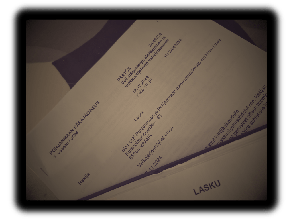 Jouluna 2023 hain apua talous- ja velkaneuvonnasta. Siitä tuli vuoden kestävä projekti, mutta joka sai positiivisen päätöksen joulukuussa 2024 käräjäoikeuden määrätessä minut velkajärjestelyyn vuosiksi 2025-2027.